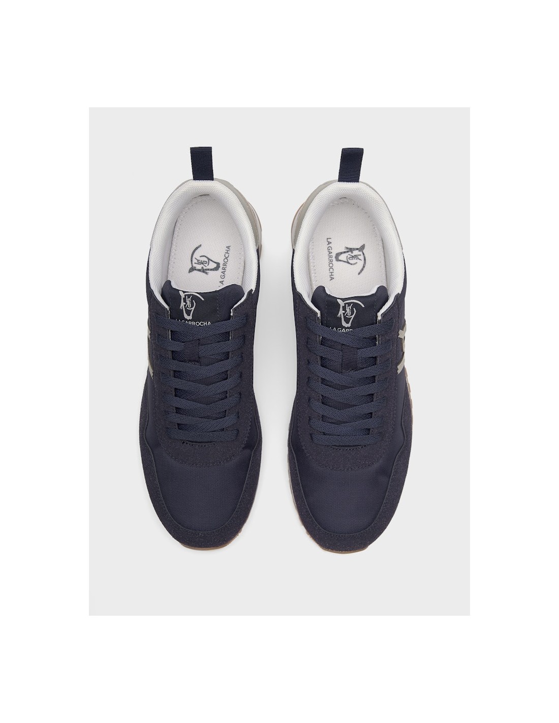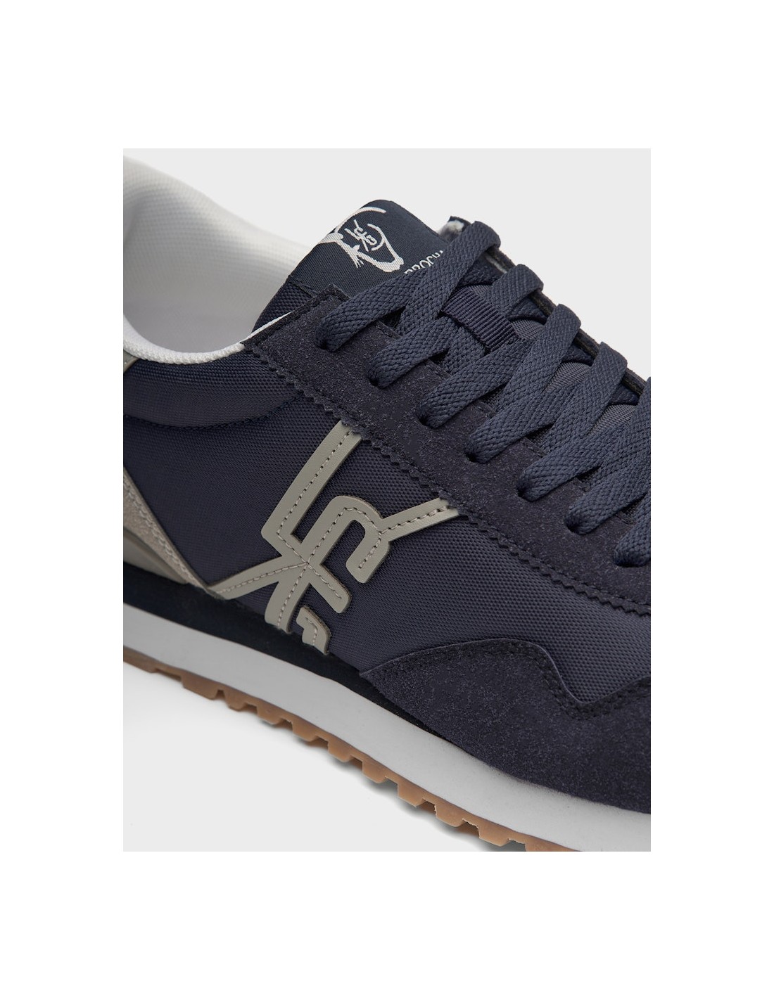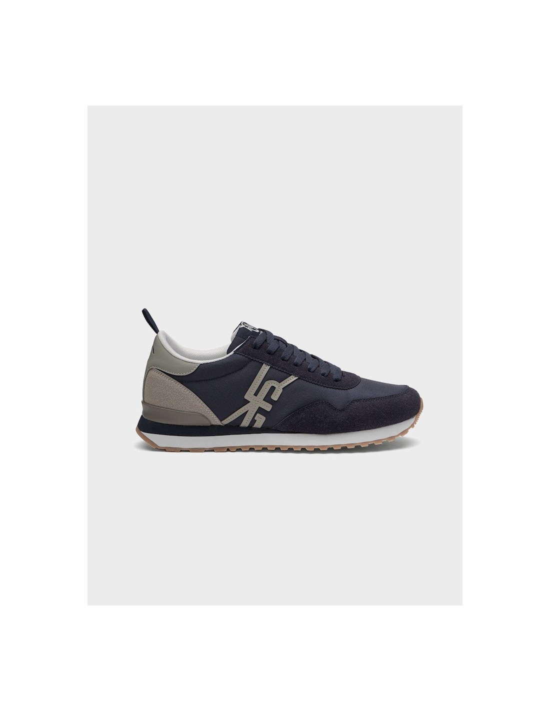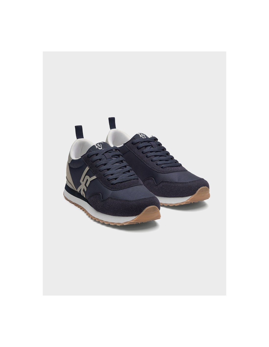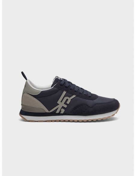Sneakers para hombre de diseño casual en azul marino. Exterior textil con detalles de ante sintético. Iniciales de nuestra marca cosidas en el lateral. Lengüeta textil con etiqueta tejida conmemorativa y talonera de piel sintética personalizada con nuestro logo a contraste. Cierre con cordones textiles. Piso de goma bicolor cómodo y ligero.