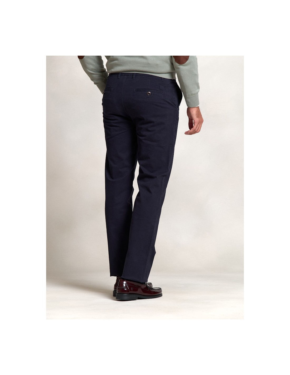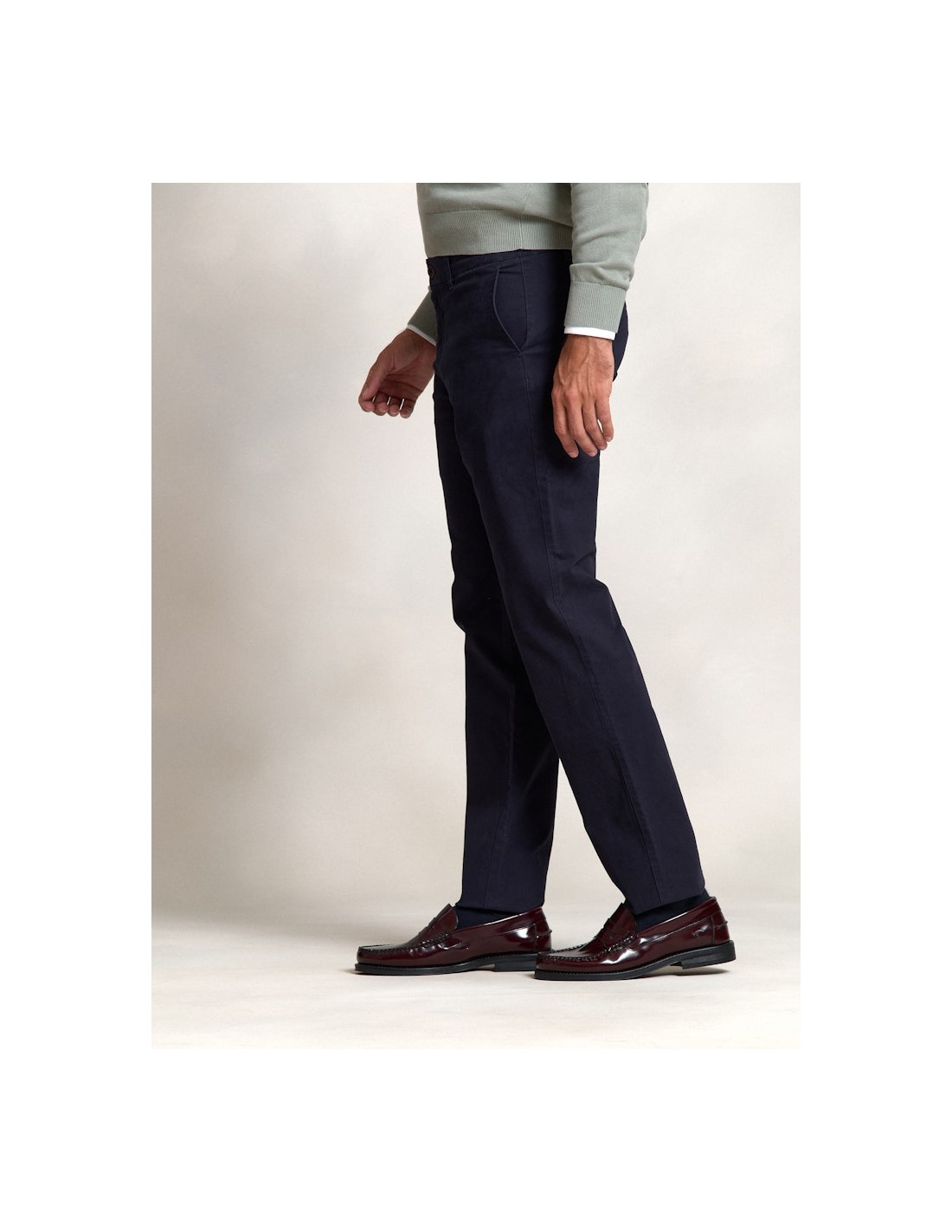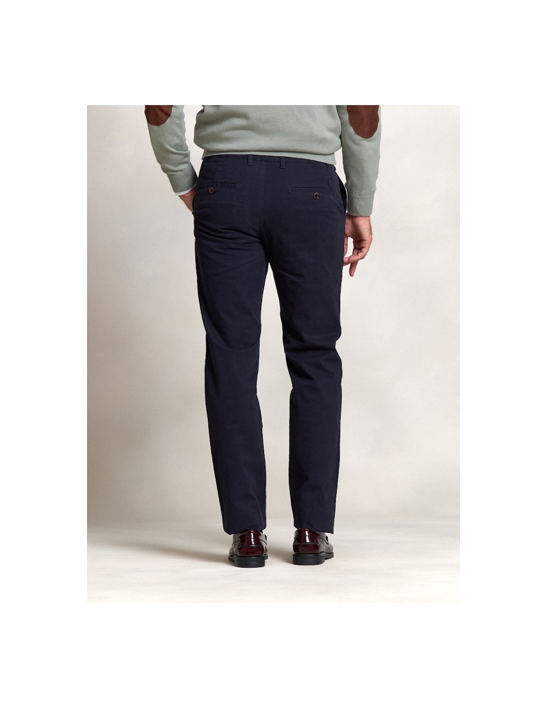 Pantalón chino de corte regular en color azul marino. Confeccionado en tejido de algodón, con un 3% de elastano. Cierre mediante botón personalizado y tapeta con cremallera oculta, trabillas para el cinturón, dos bolsillos laterales y bolsillo cerillero en la parte delantera, bolsillos de ojal abotonado en la parte posterior. Etiqueta trasera con bordado de nuestro caballo.