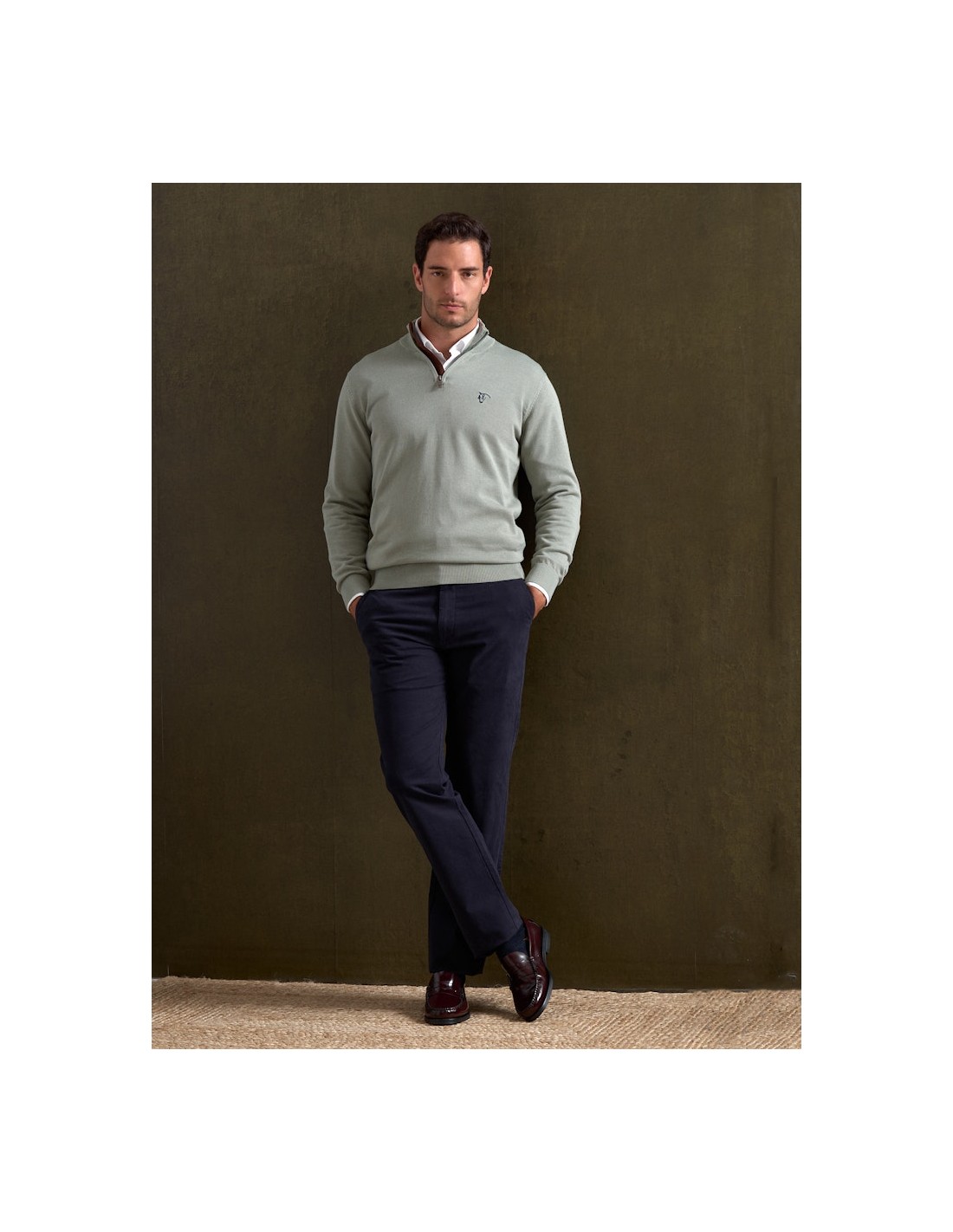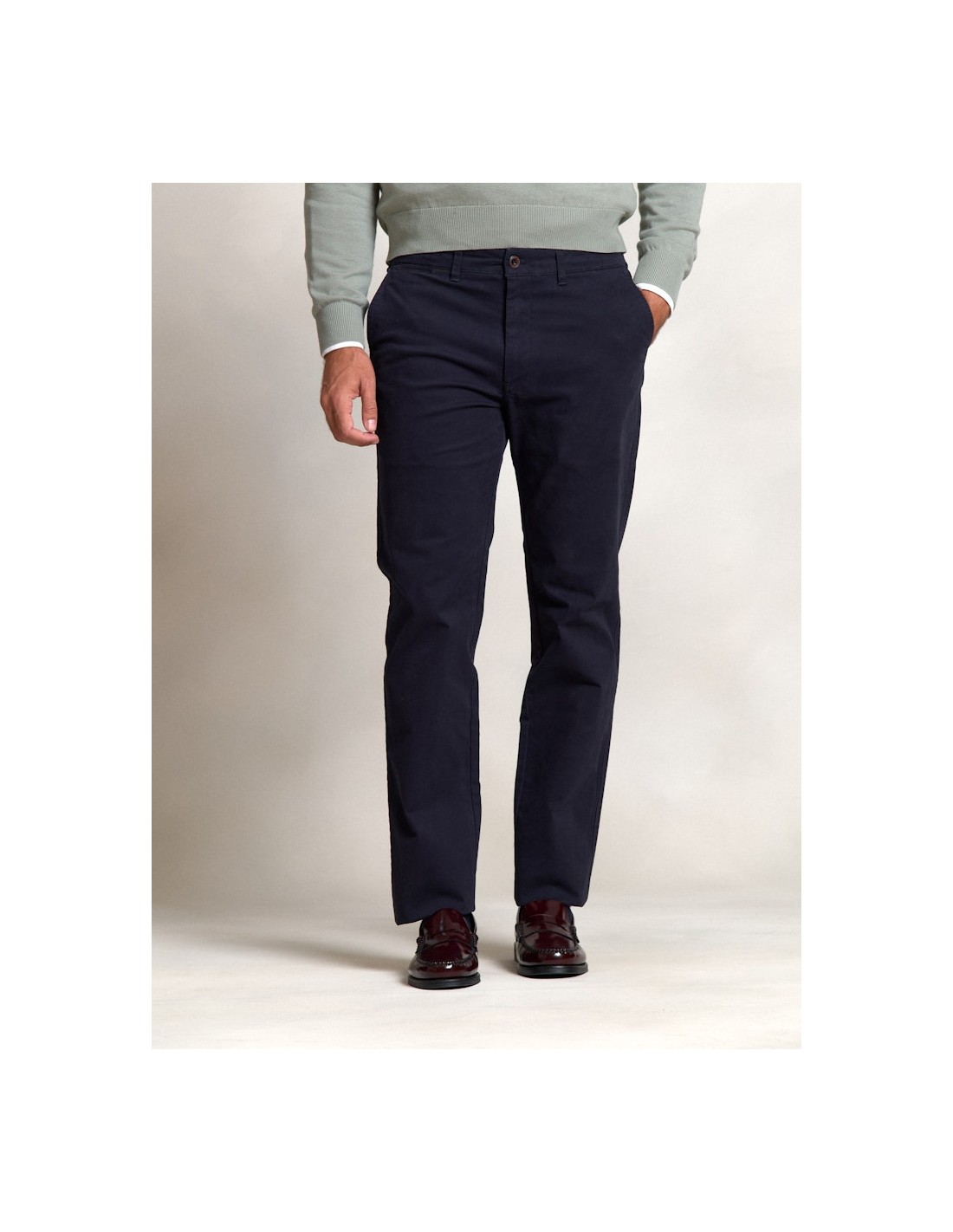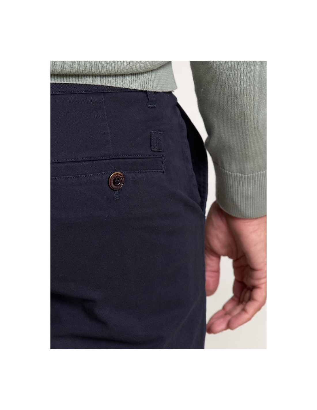 Pantalón chino de corte regular en color azul marino. Confeccionado en tejido de algodón, con un 3% de elastano. Cierre mediante botón personalizado y tapeta con cremallera oculta, trabillas para el cinturón, dos bolsillos laterales y bolsillo cerillero en la parte delantera, bolsillos de ojal abotonado en la parte posterior. Etiqueta trasera con bordado de nuestro caballo.
